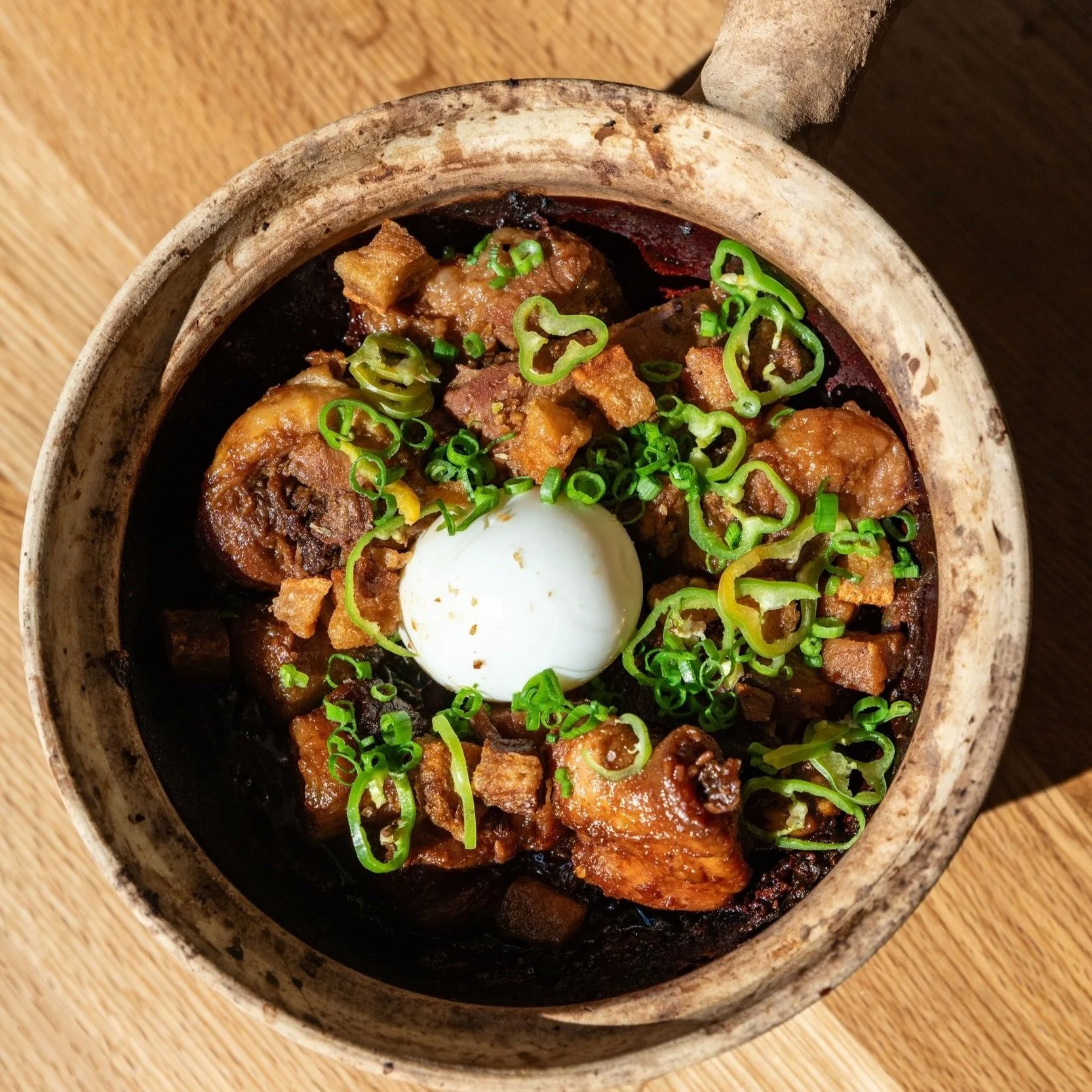 claypot cooked chicken, pork belly, garlic rice, bay leaf, peppercorn